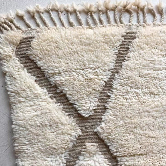 Réalisé en 100 % laine, le tapis Béni Ouarain se distingue par son moelleux, sa régularité et la finesse de son tissage. Conçu au sein de coopératives du Moyen Atlas, chaque tapis reflète un travail fait main précis et maîtrisé, donnant naissance à des pièces à la fois élégantes, durables et agréables au quotidien.