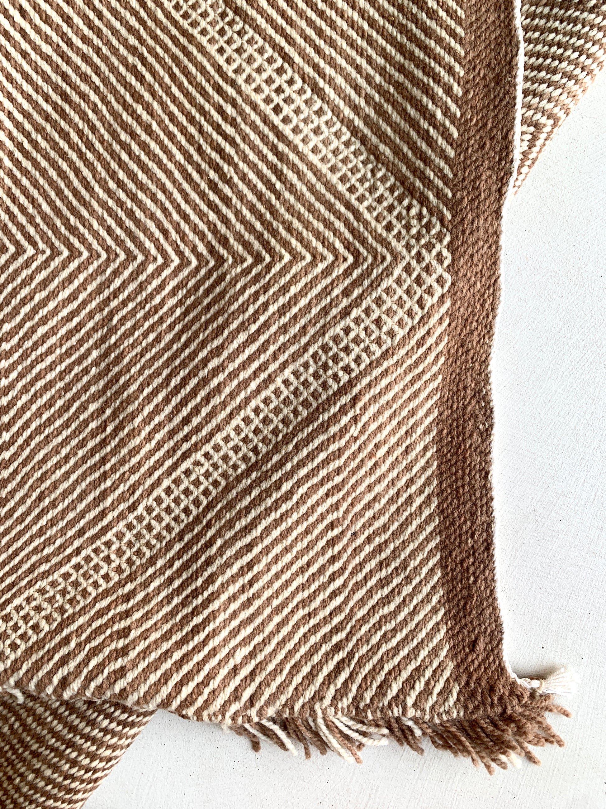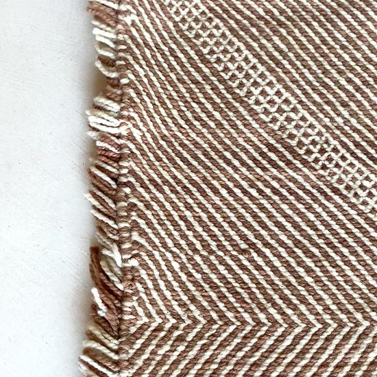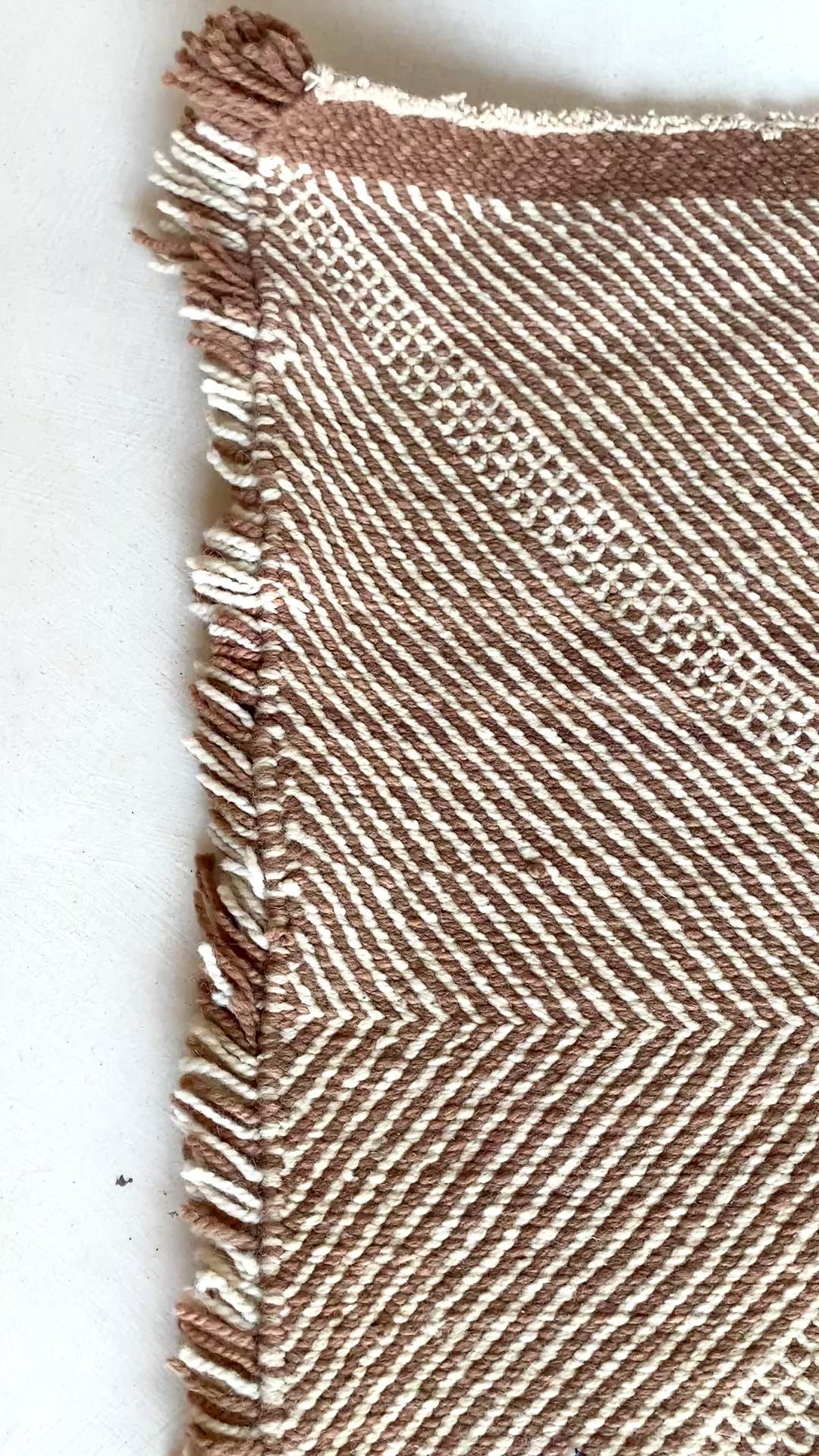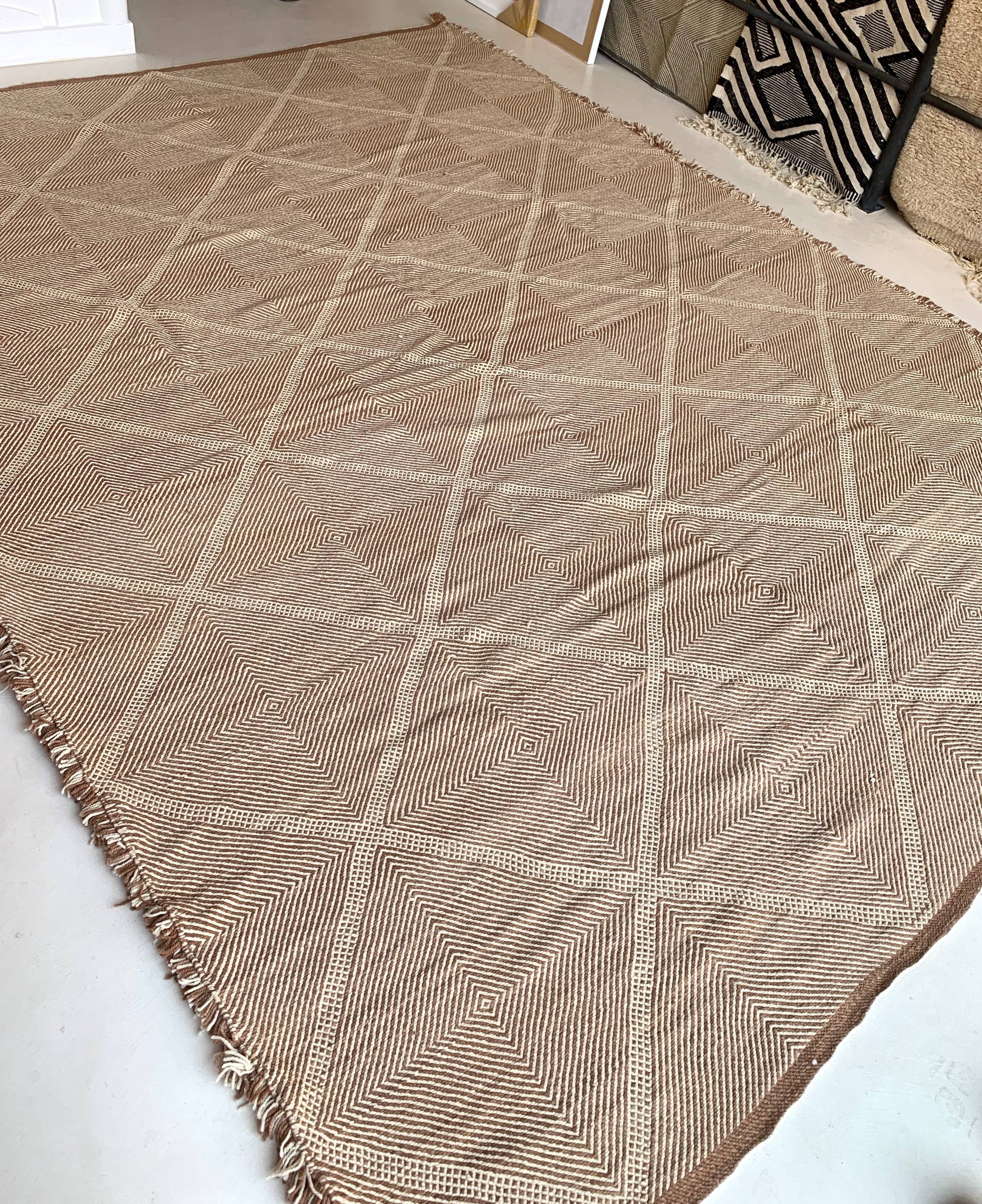 Joli tapis kilim 100% laine dans les tons beige foncés avec broderie écrues contrastées, ceux que nous préférons !