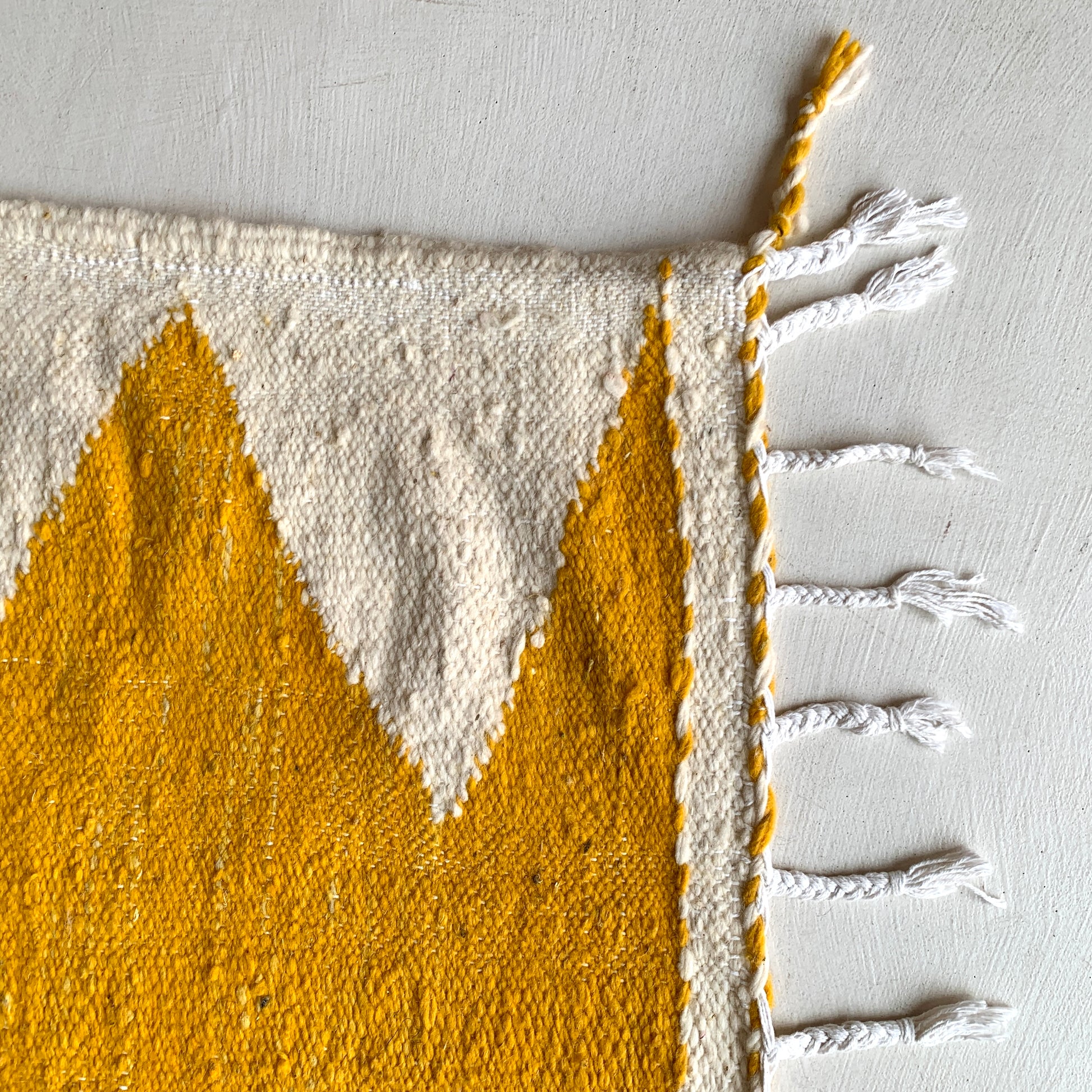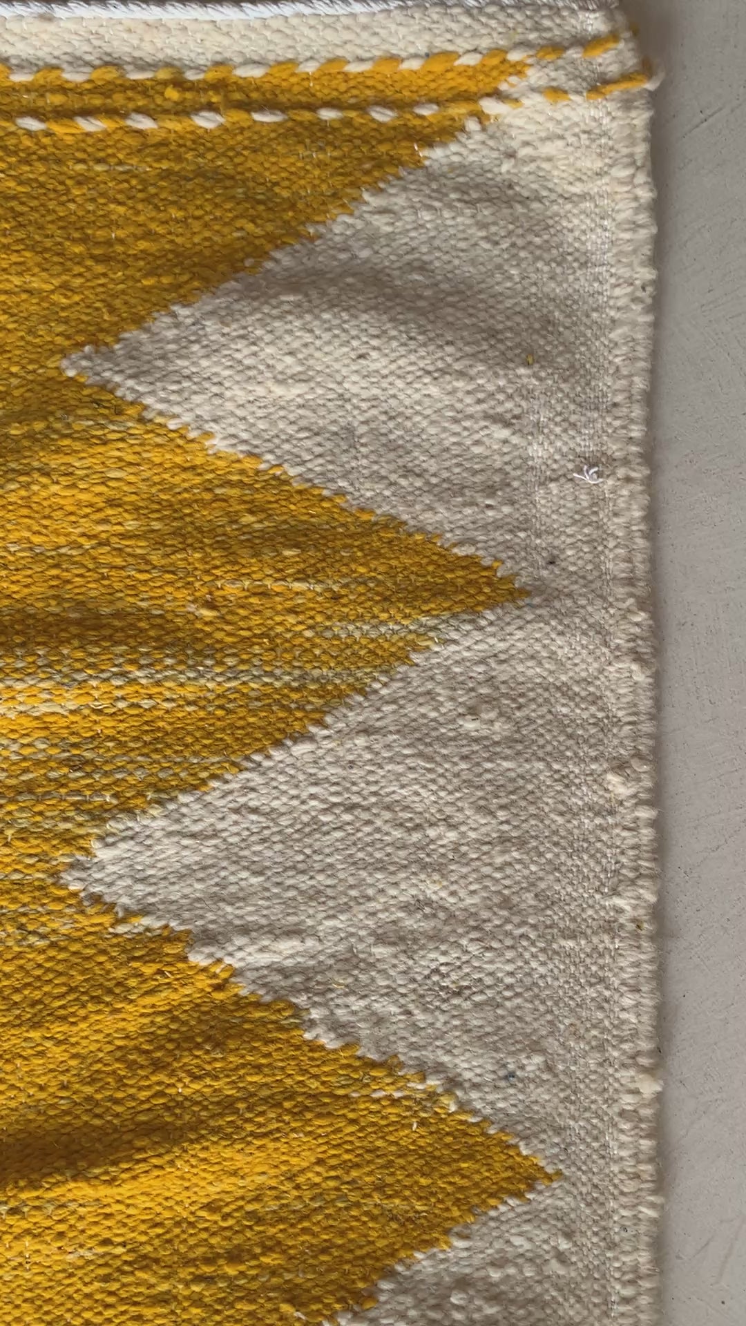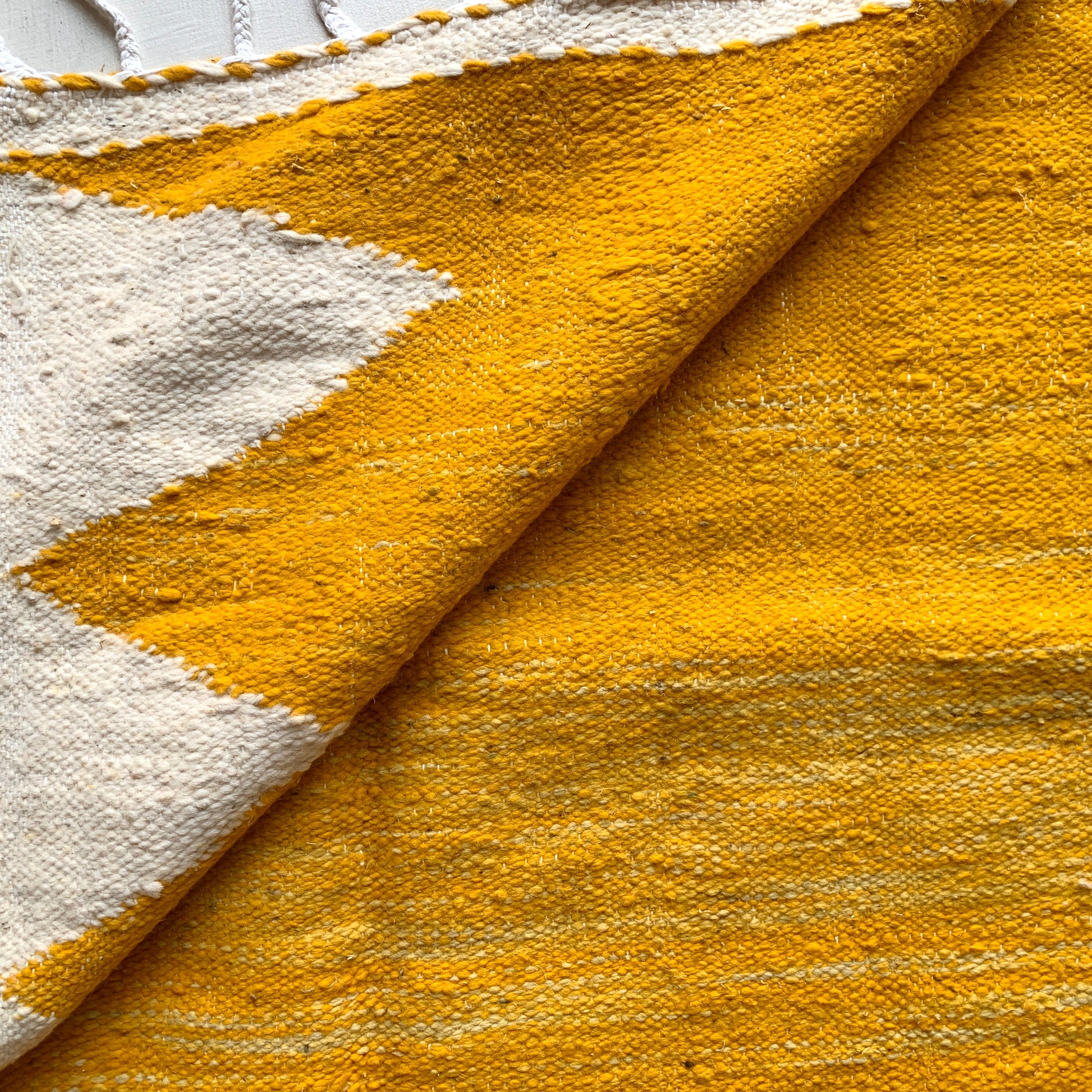 Superbe tapis kilim jaune 100% laine dans leur design coloré et raffiné est composé de motifs traditionnels, où les couleurs harmonieuses s'entrelacent pour créer des œuvres d'art textiles qui s'adaptent à tous les styles de décoration !