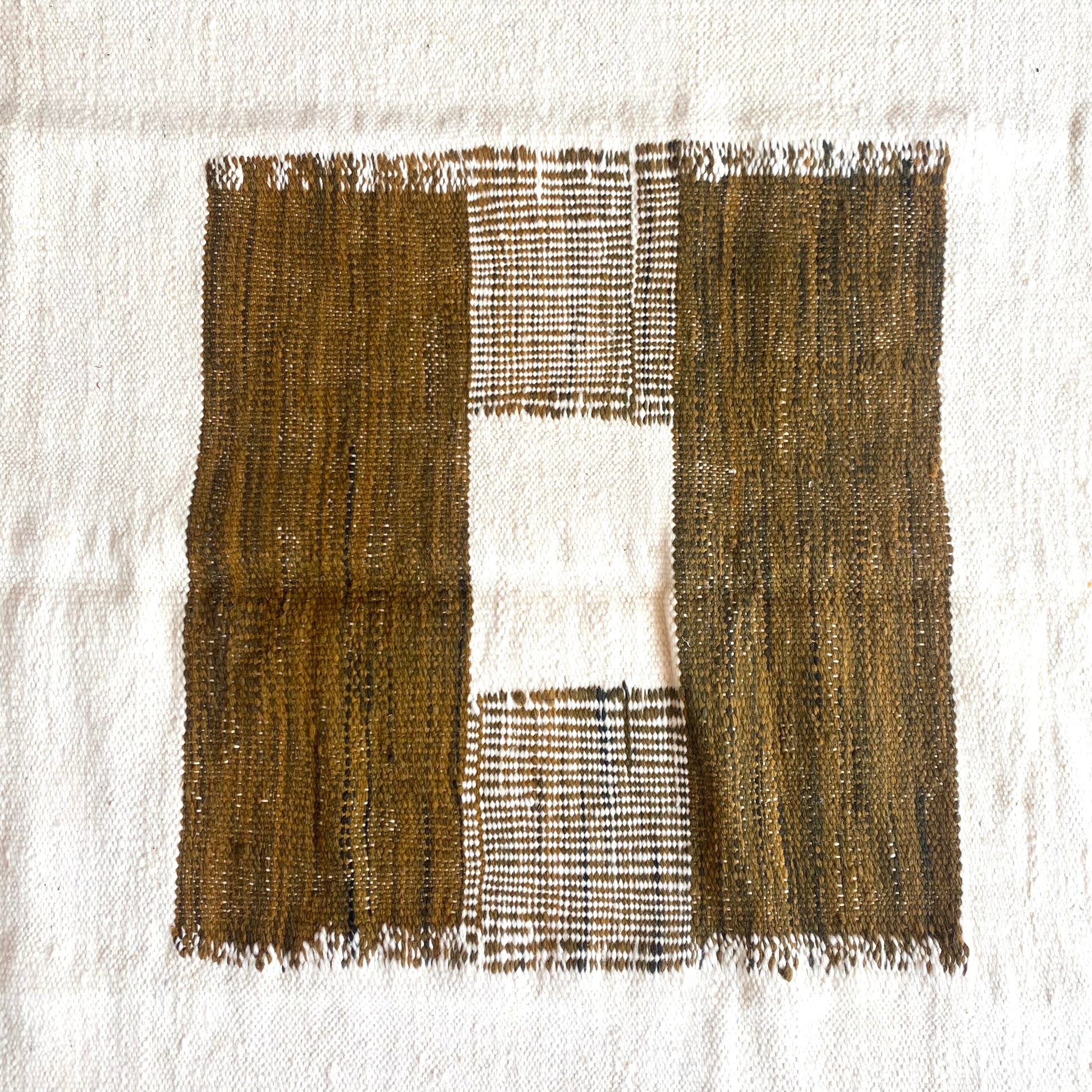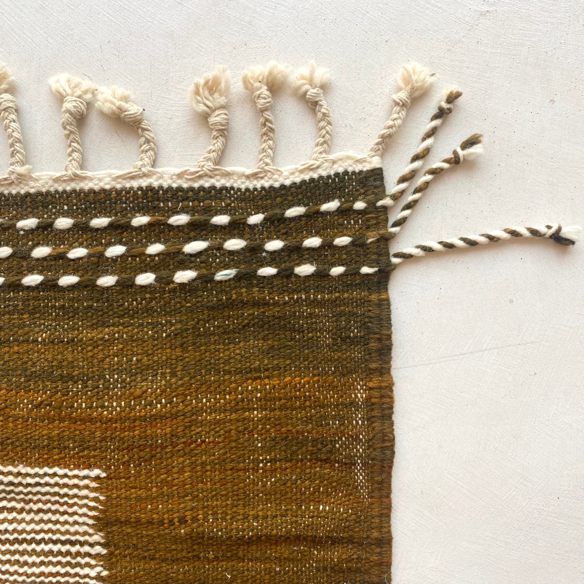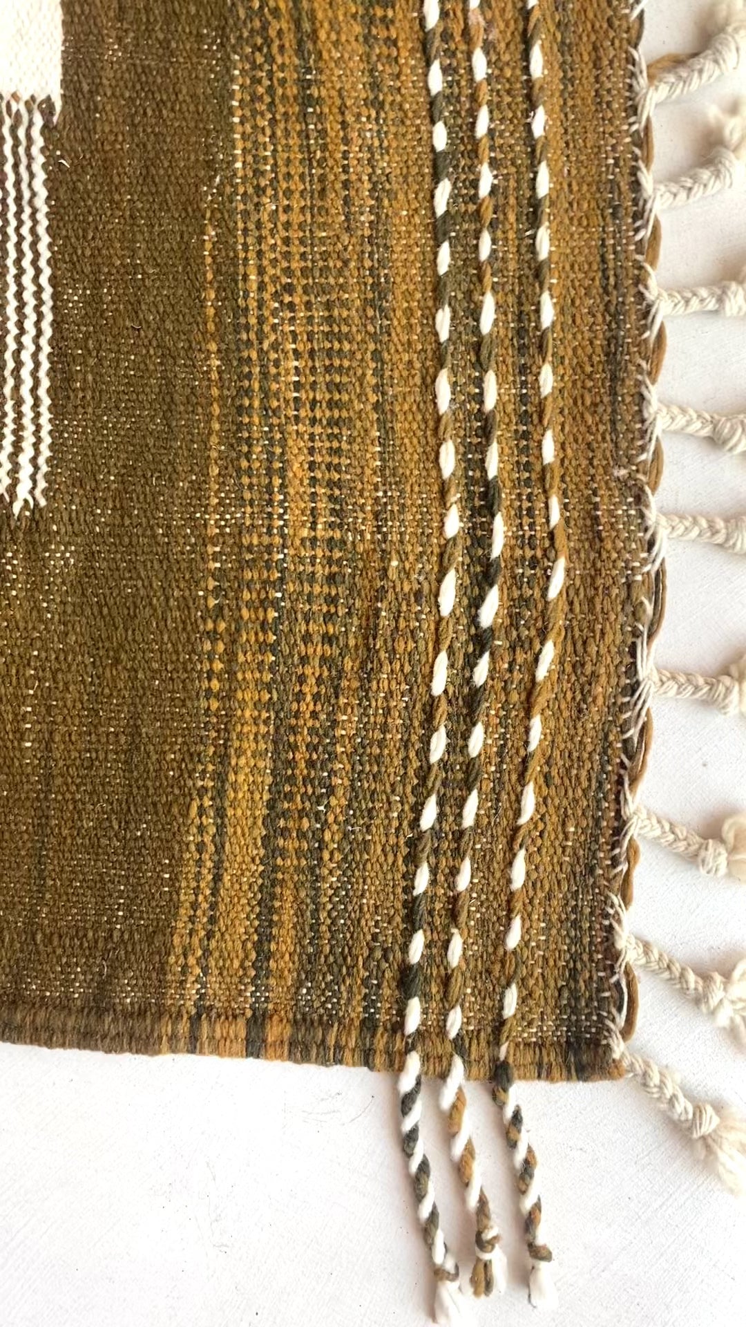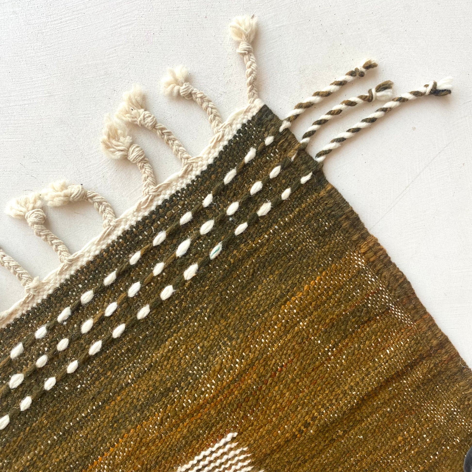 Superbe tapis kilim 100% laine dans un coloris mélange entre le vert olive, marron ainsi que le blanc pour un intérieur tout doux !