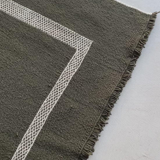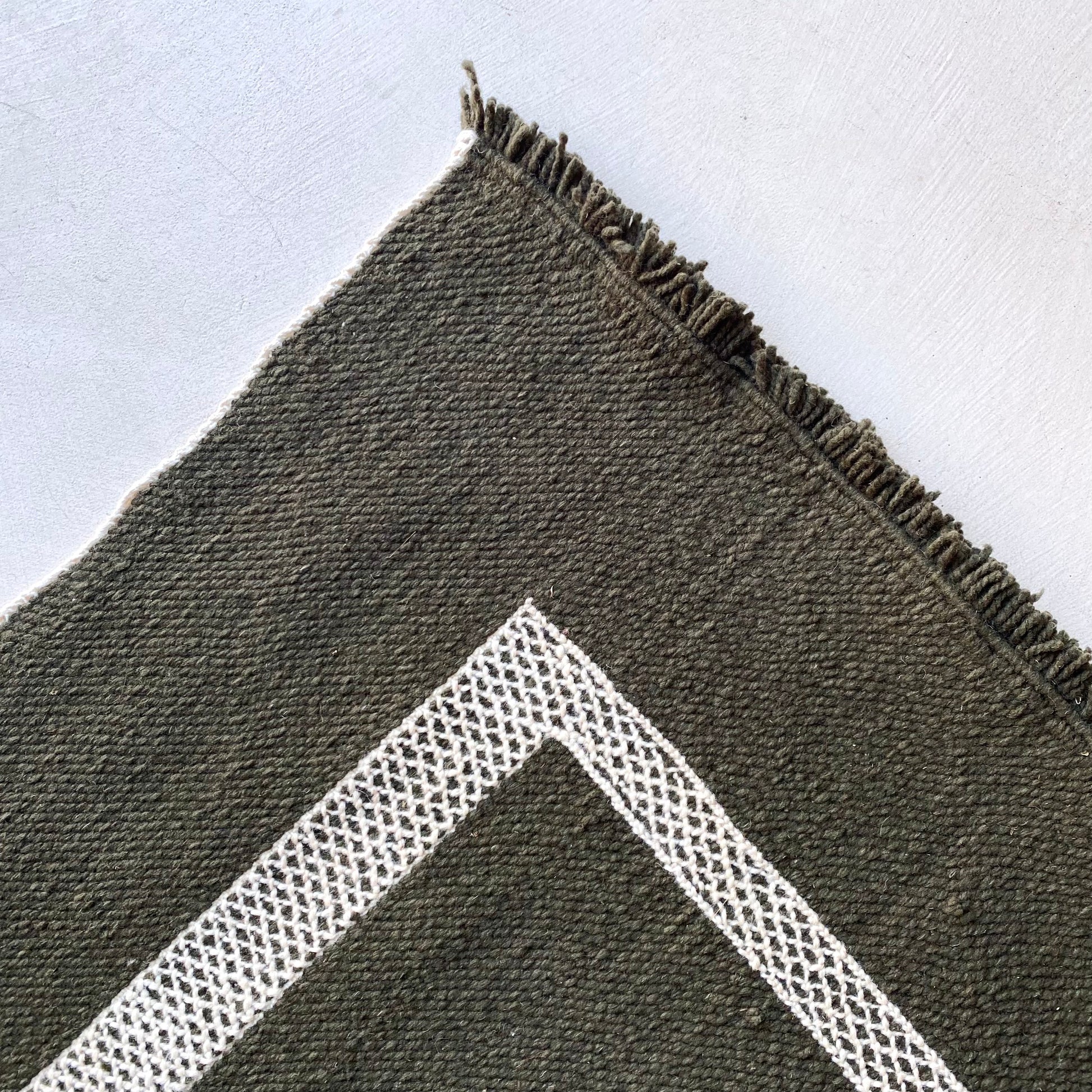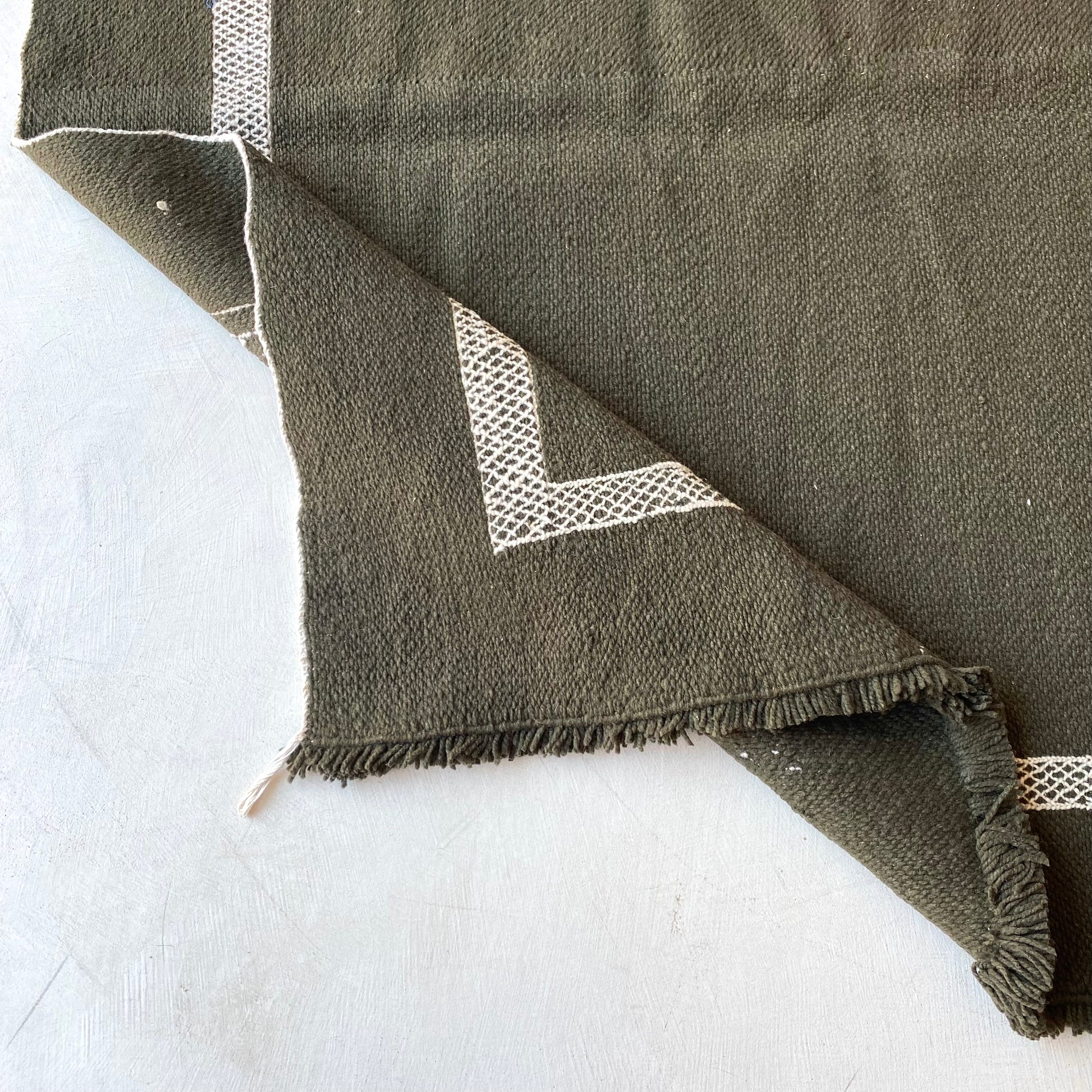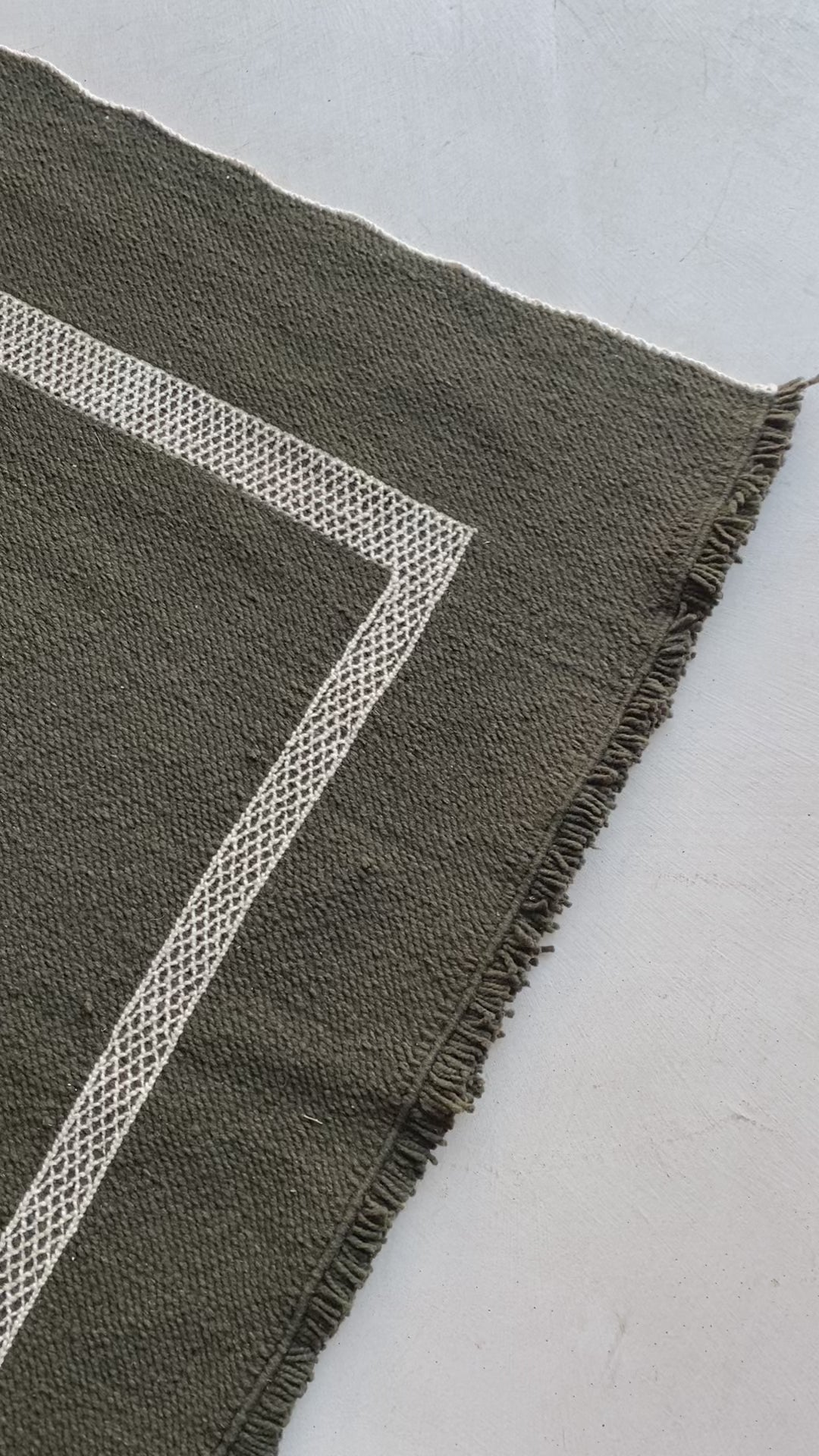 Superbe tapis kilim 100% laine dans les tons verts et blancs.