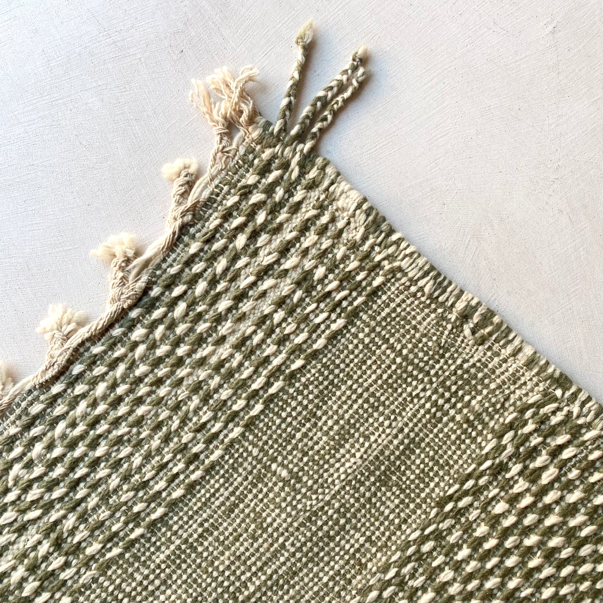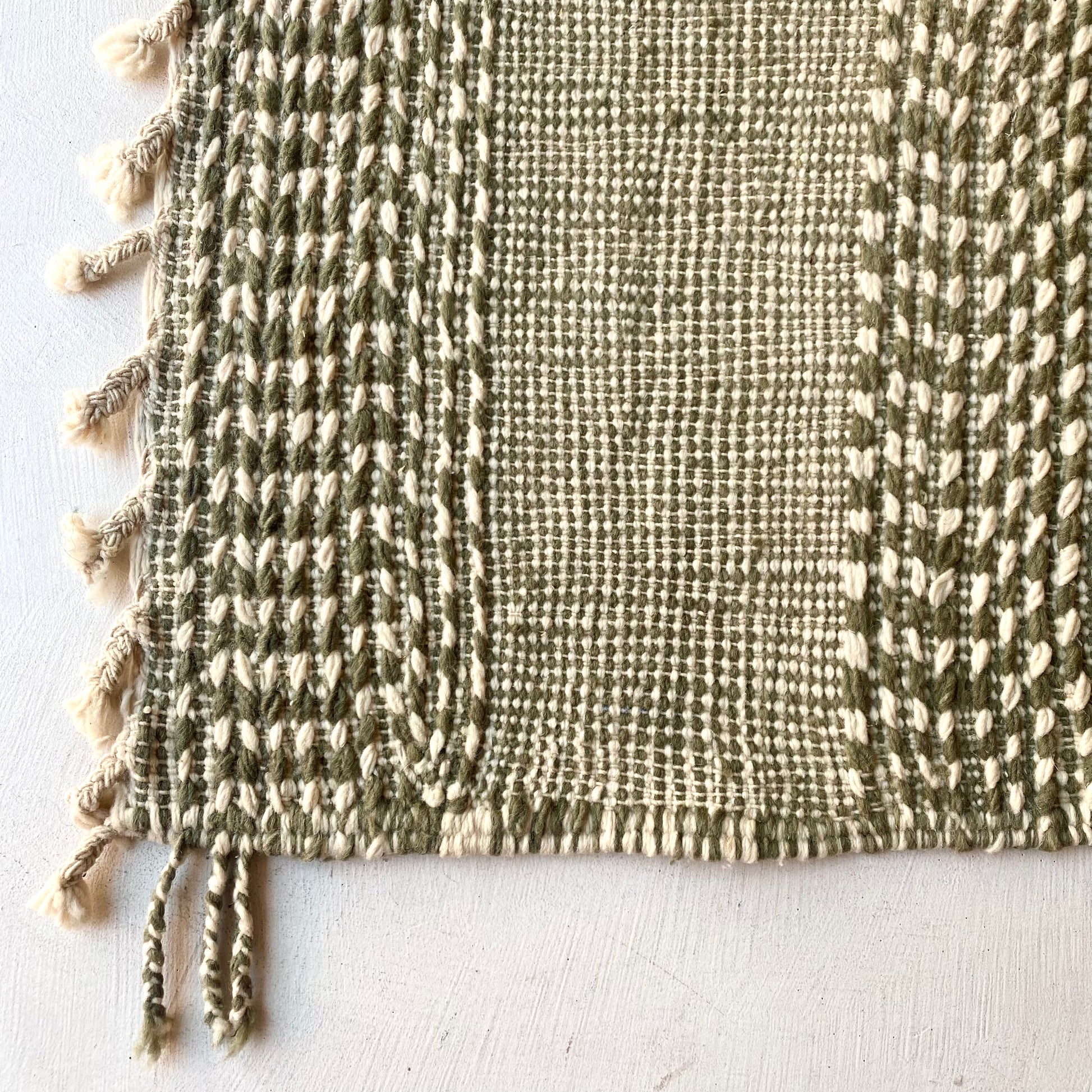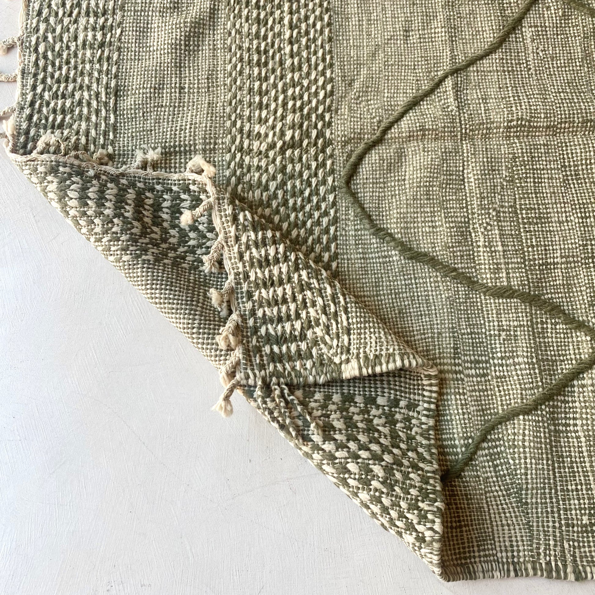 Joli tapis zanafi dans les tons vert-gris et blancs avec broderie écrues contrastées, ceux que nous préférons !
